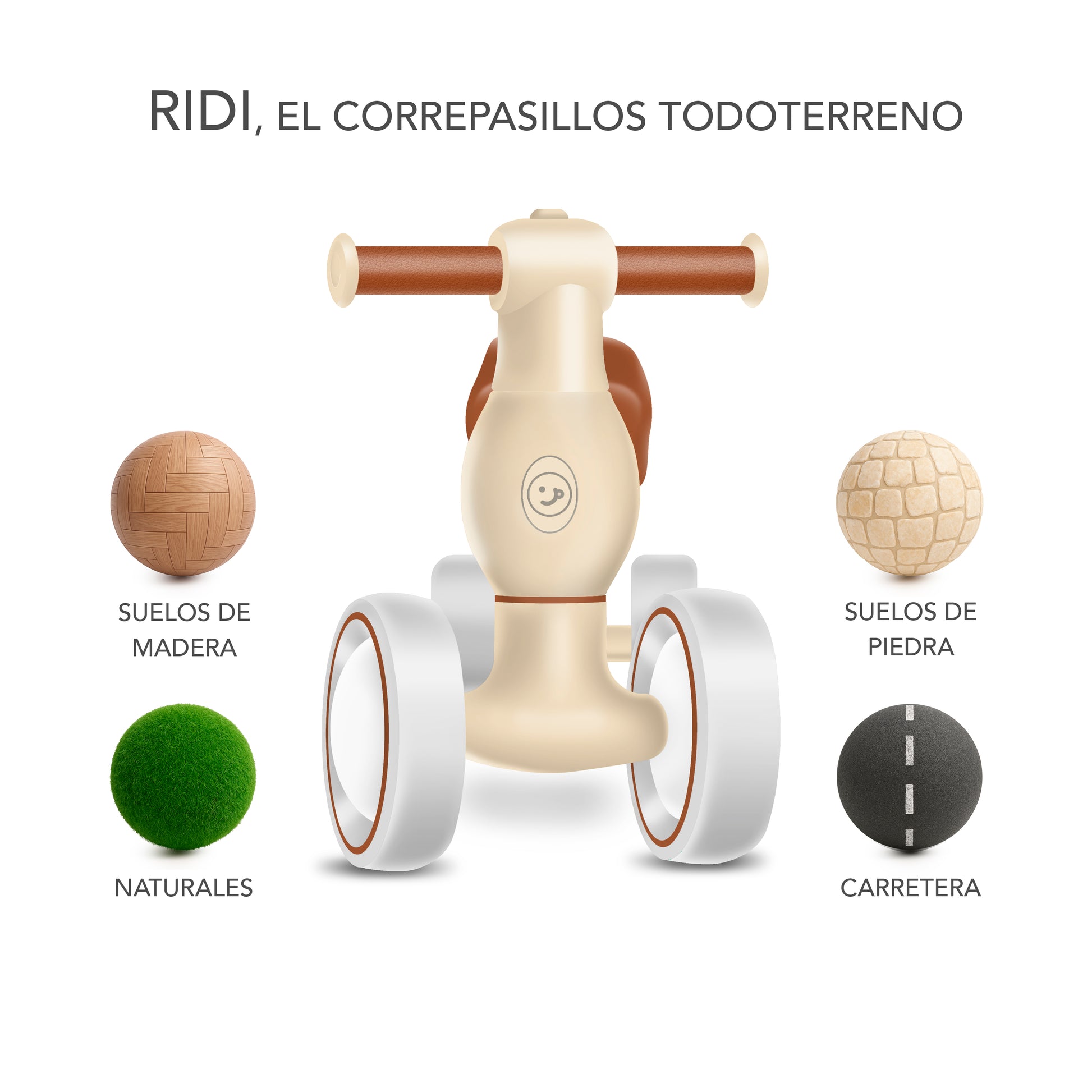 Descubre el correpasillos sin pedales para bebés en color beige que enamora por su diseño suave, funcionalidad y seguridad. El Ridi Correpasillos está pensado para peques de entre 10 a 24 meses, con un cuerpo redondeado, asiento acolchado y ruedas todoterreno que permiten rodar cómodamente por parquet, tierra, césped, piedra o asfalto.