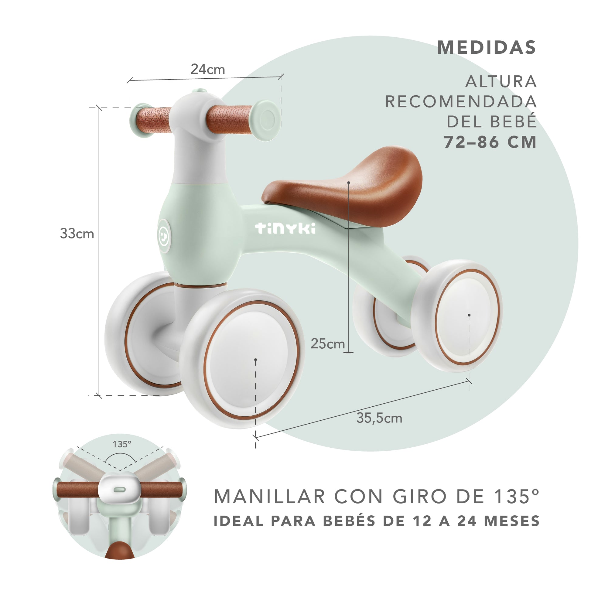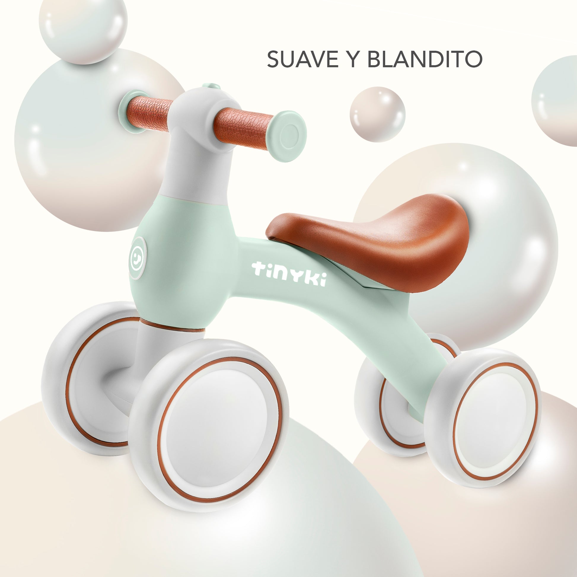 Haz que cada paseo cuente con el correpasillos verde pastel sin pedales para bebés de Tinyki. Diseñado para niños y niñas de 10 a 24 meses, este correpasillos destaca por su diseño redondeado, sillín suave y ruedas silenciosas aptas para todo tipo de suelos: desde parquet hasta caminos de tierra o césped. Es ligero, robusto y pensado para la comodidad de los más pequeños.